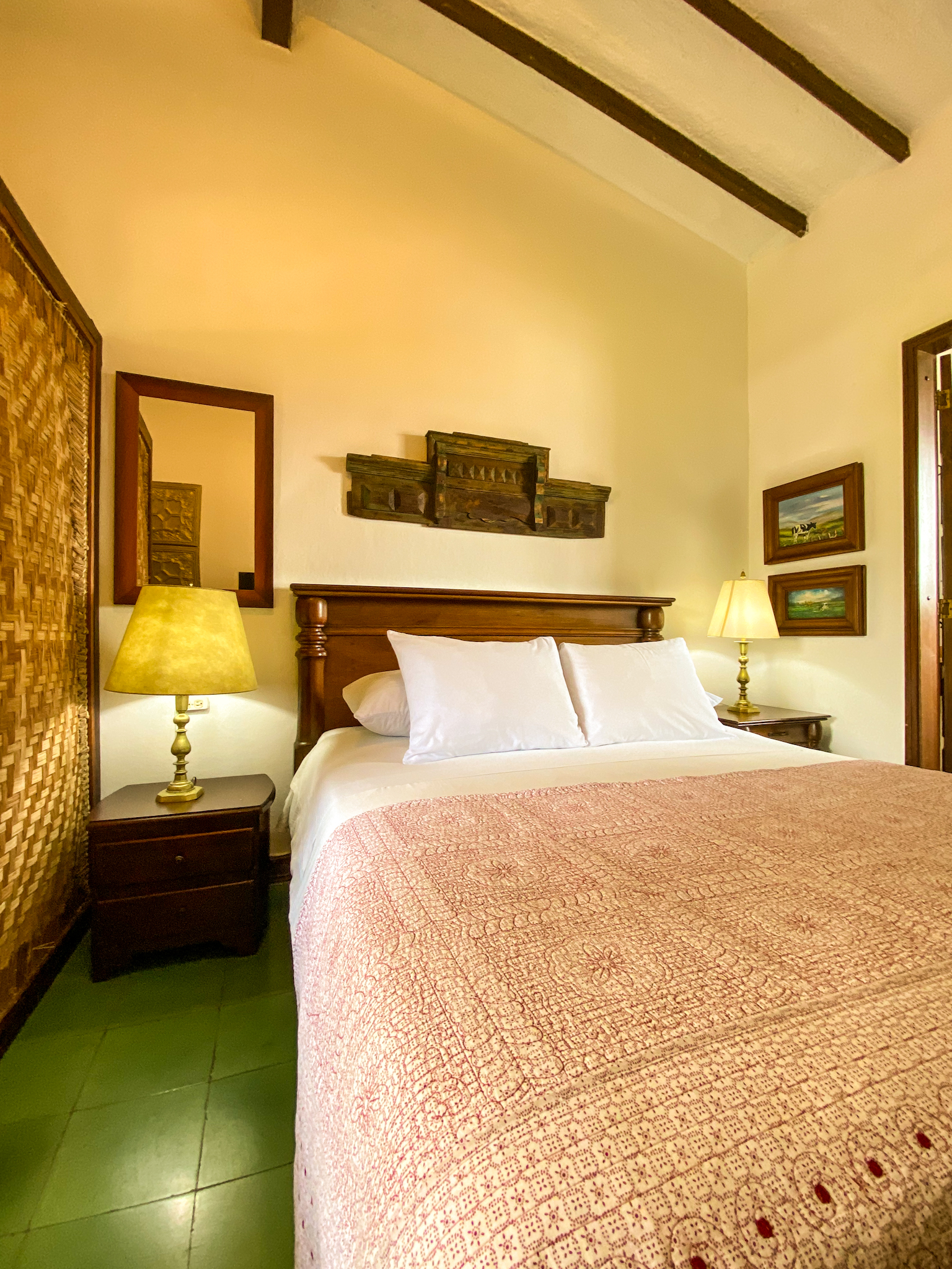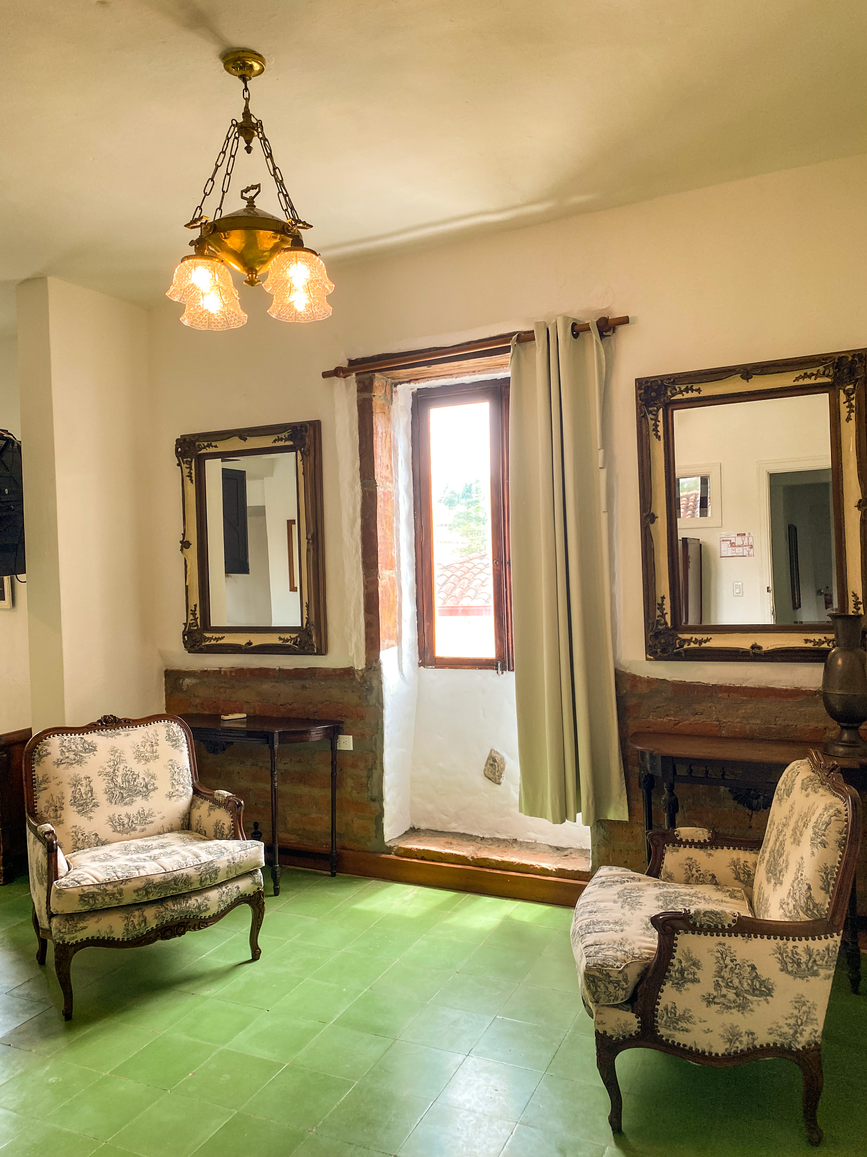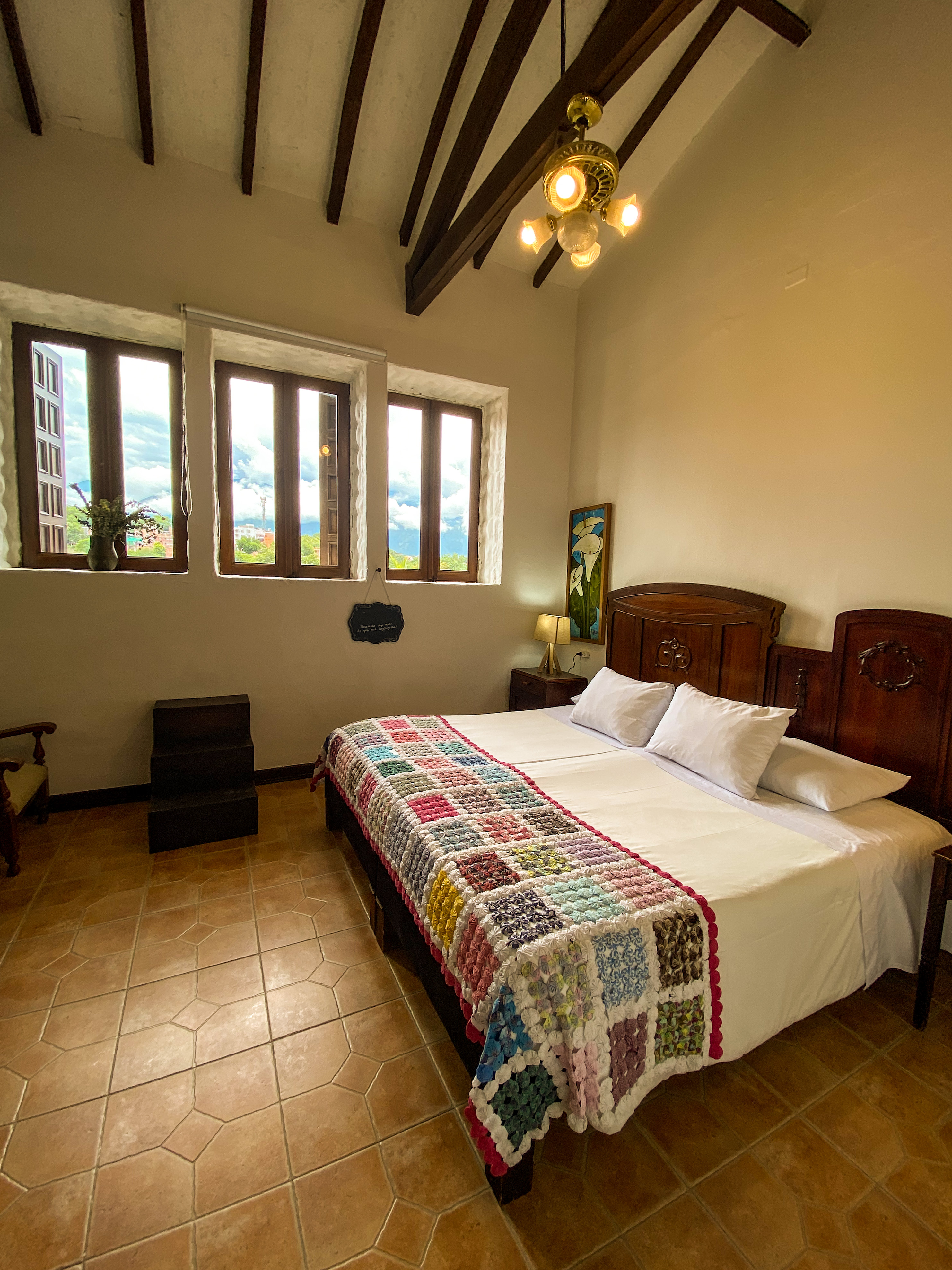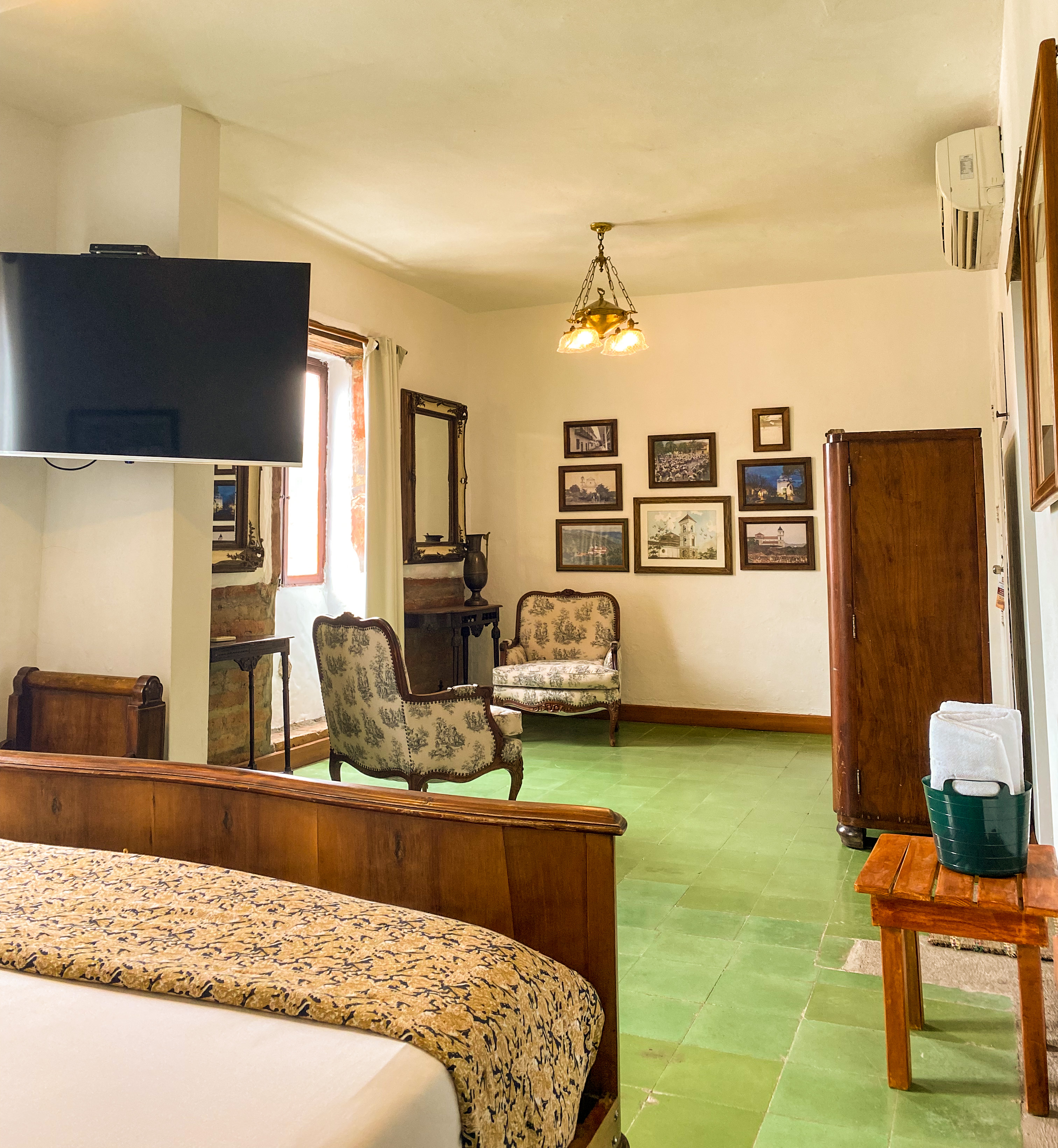 La joya de nuestra oferta de alojamiento es la habitación Mariscal, la más espaciosa de todas, cuenta con una una cama king. Con capacidad para dos personas, esta habitación se distingue por su estilo colonial, adornado con muebles de madera, bellos cuadros y lámparas que evocan una atmósfera de elegancia y calidez. Las vistas desde la habitación son simplemente impresionantes, abarcando desde las majestuosas montañas hasta la histórica catedral del municipio. La habitación Mariscal no solo ofrece mayor comodidad y privacidad, sino que también promete una experiencia única, donde la historia y la modernidad se encuentran para crear un refugio de lujo y serenida
